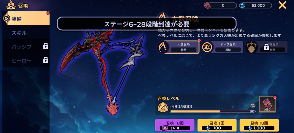 - チュートリアル段階で引ける大鎌ガチャやスキルガチャは召喚レベルというものがあり、召喚レベルはたくさん引くほどよいレアリティのものが出やすくなる仕様
