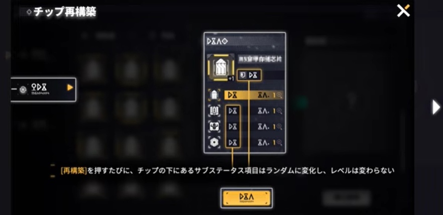 再構築とは、チップ自体のレベルを維持したまま、サブステータスの種類や数値をランダムに変化させる機能です。メインステータスは固定されますが、サブステータスの項目や配置はランダムに入れ替わります。