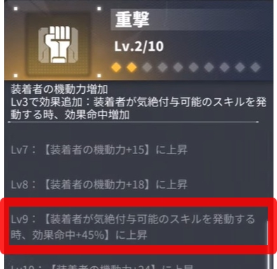 ハトリの性能を完璧に引き出せるのが重撃チップです。気絶付与スキルを持つハトリとの相性は抜群です。気絶付与スキル使用時に効果命中が45パーセントも上昇します。