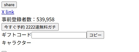 また、公式サイトにアクセスをしたら不具合があるようでうまく表示されてないのですが、ギフトコードという文字はあったのでギフトコードは実装されることがほぼ確実でしょう。ゲーム内でギフトコードを入力するのか、それとも公式サイトに入力するのかは不明ですが、リリース後に詳しく記載します。