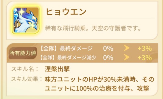 単一の味方ユニットが10回攻撃を受ける毎に敵1体を打ち上げる。スキルはそこまで有用でなさそう。