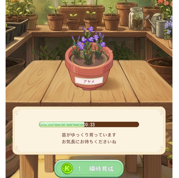 育成にはそれぞれの植物によってかなり差がある(アヤメの育成は1分など)ので、フリージアは夜寝る前とかに育成しましょう。