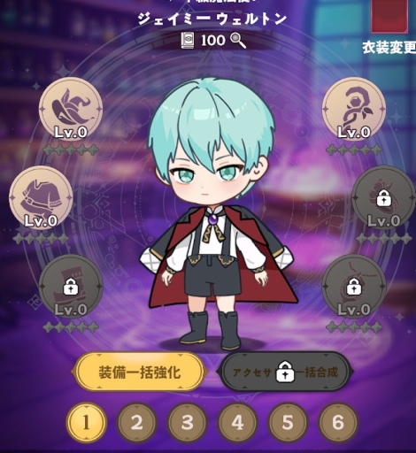 キャラクターの育成画面を見ていると、装備は6つのスロットが存在しており、それぞれにレベルと星ランクがあるようです。アクセサリー一括合成とあるので、装備の他にアクセサリーもあるようです。こういった装備・アクセサリーによって各キャラクターのステータスアップ効果があると思われます。