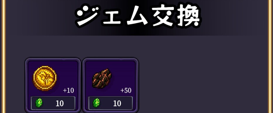 - ジェム交換:ジェム10個でコイン10枚と交換
