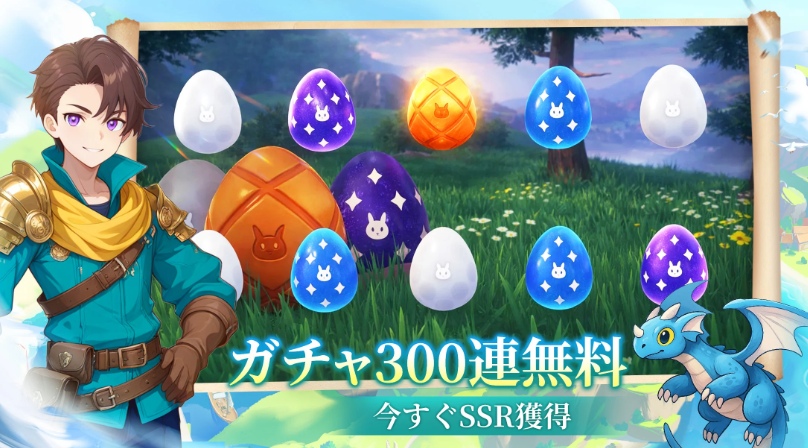 最高レアリティは判明している限りSSRのようです。ガチャ300連無料とありますが、こちらはおそらくログインボーナスなどで30日間毎日ガチャチケ10枚を配布するとかの類だと思われます。