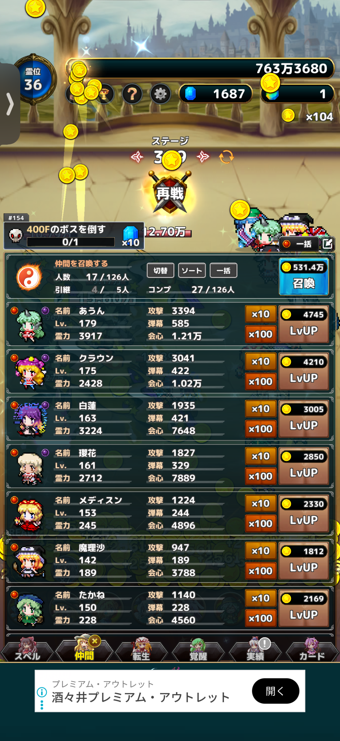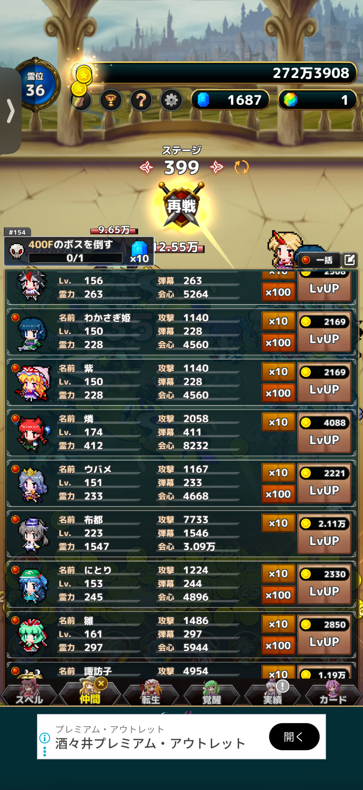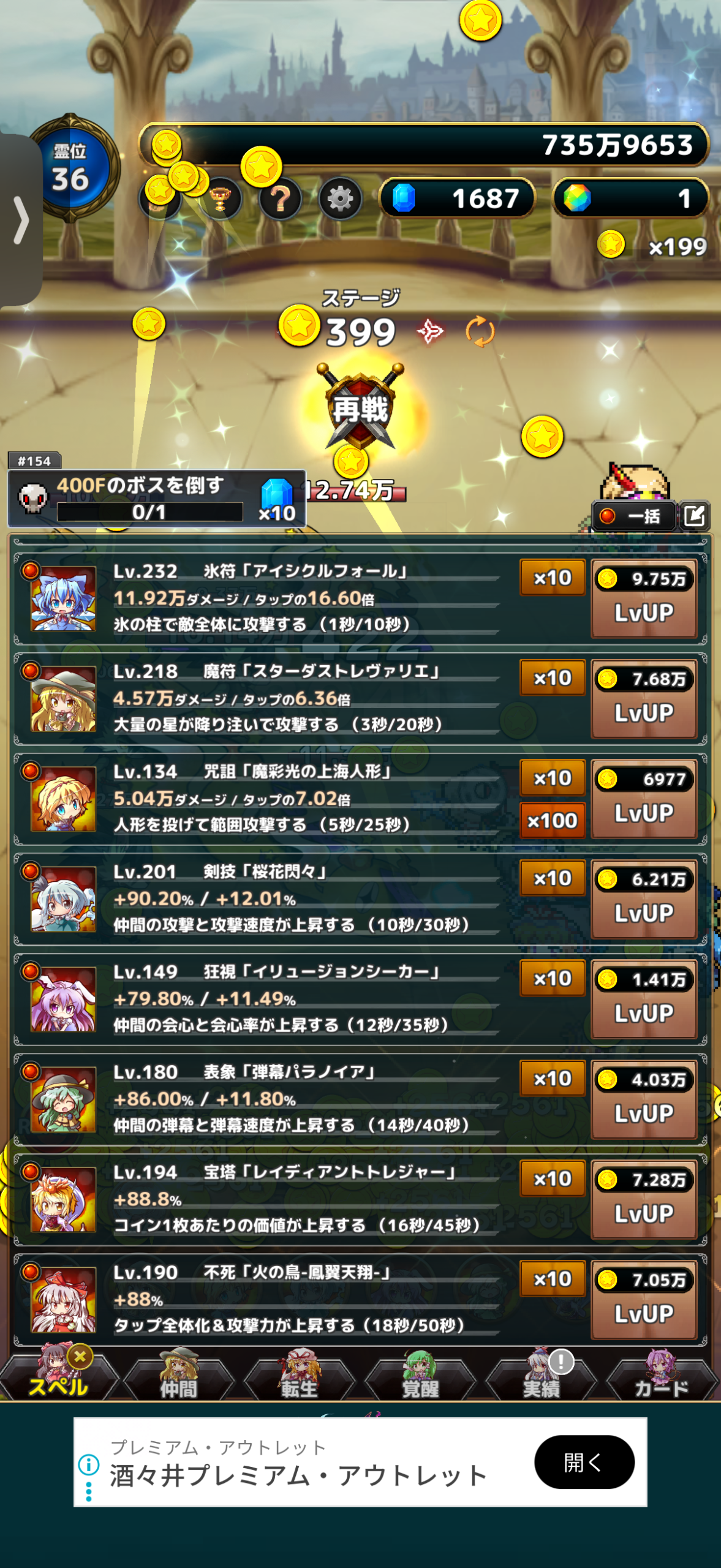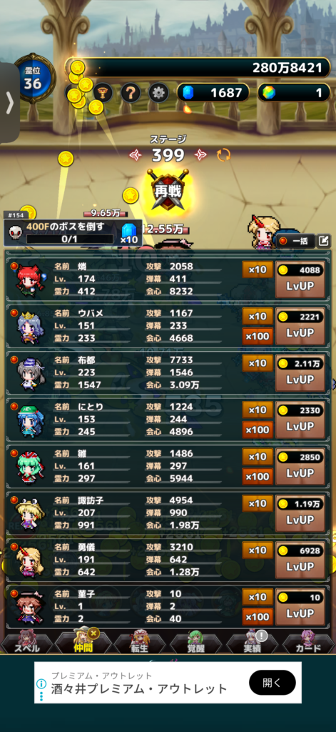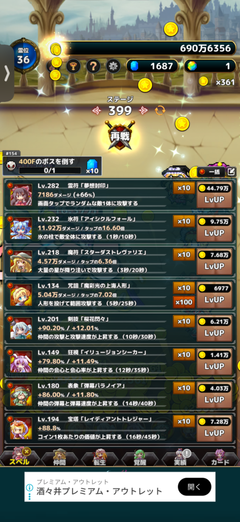 東方異変クリッカーをプレイしていますが、このゲームはハクスラ系でどんどん時間をかけて攻略をしていくごとにコインがたまっていき、それで仲間を強化したり、スペルを習得・強化したりなどで新ステージを攻略していけるようになります。